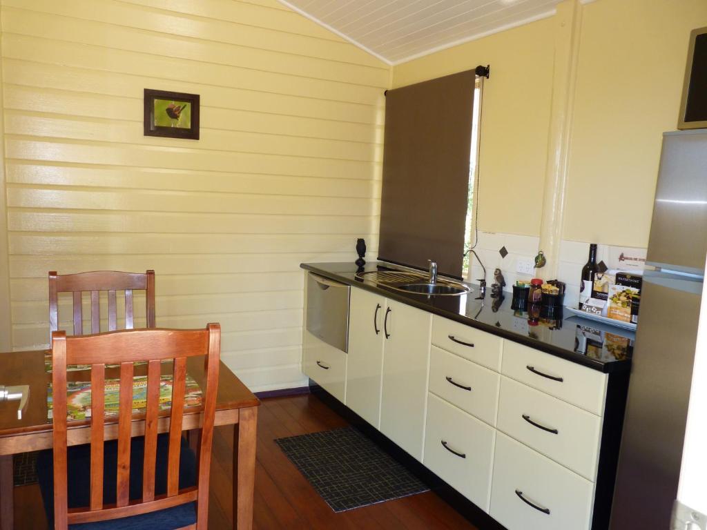 This cottage features a queen bed, double sofa bed, double spa bath, private deck, separate kitchen, and a seasonal dam view. Upon arrival, guests receive free chocolates and 70 grams of Coffeeworks coffee.